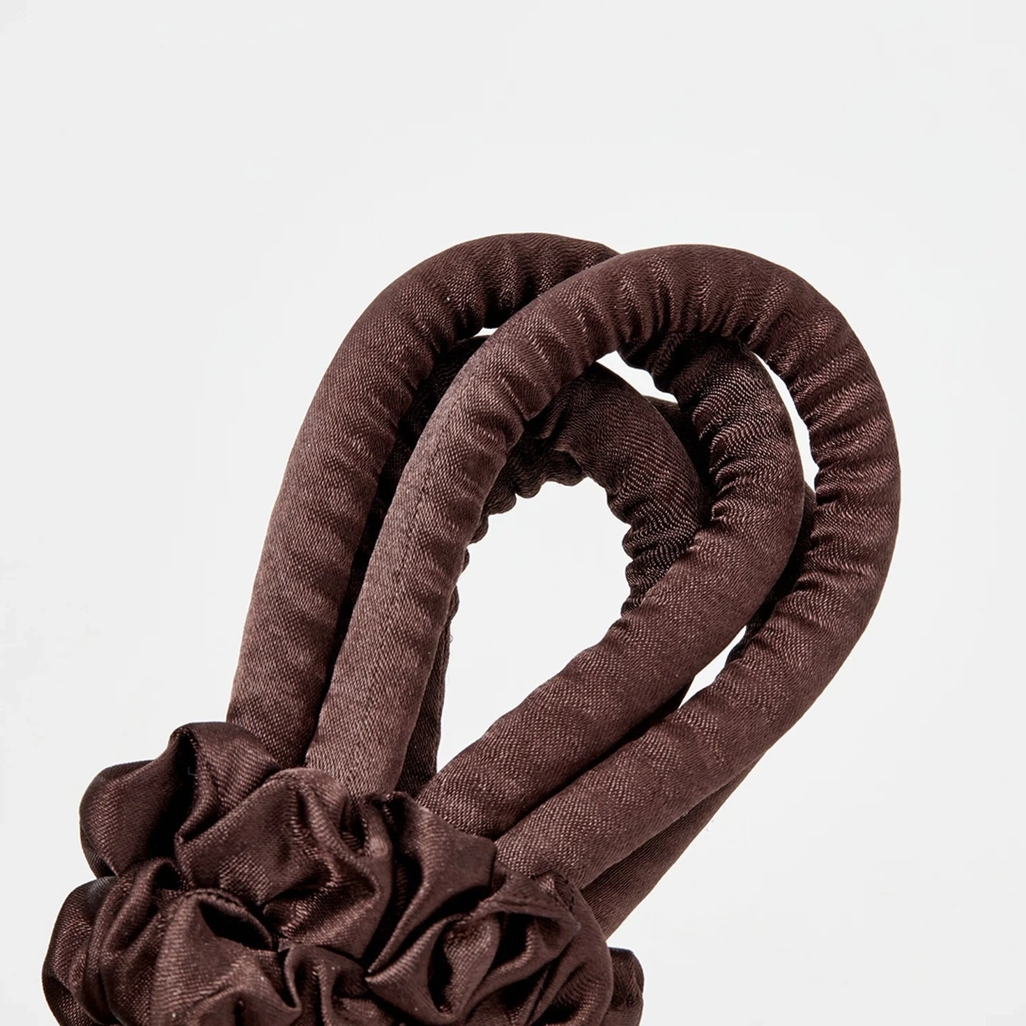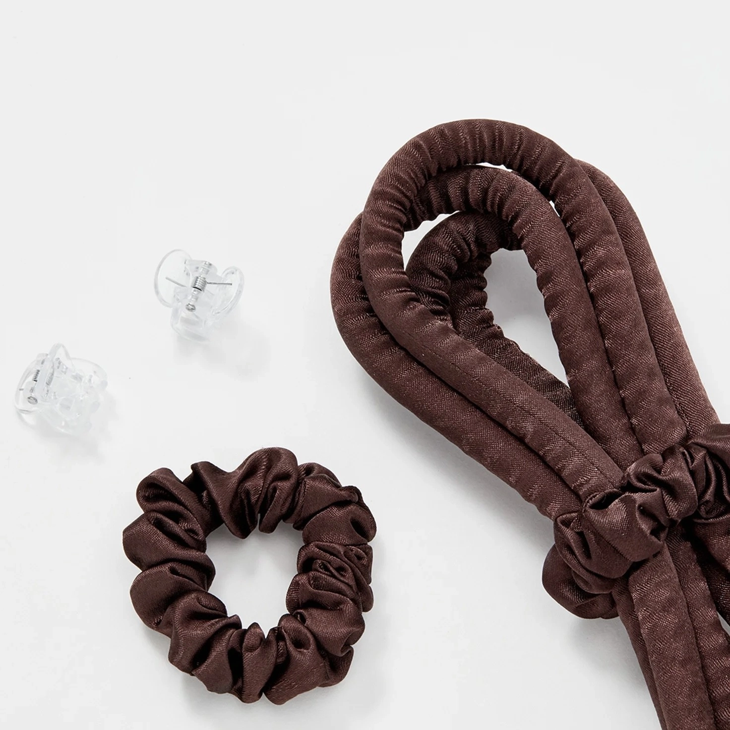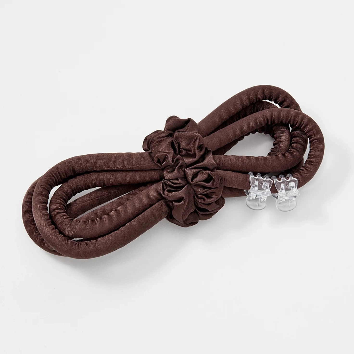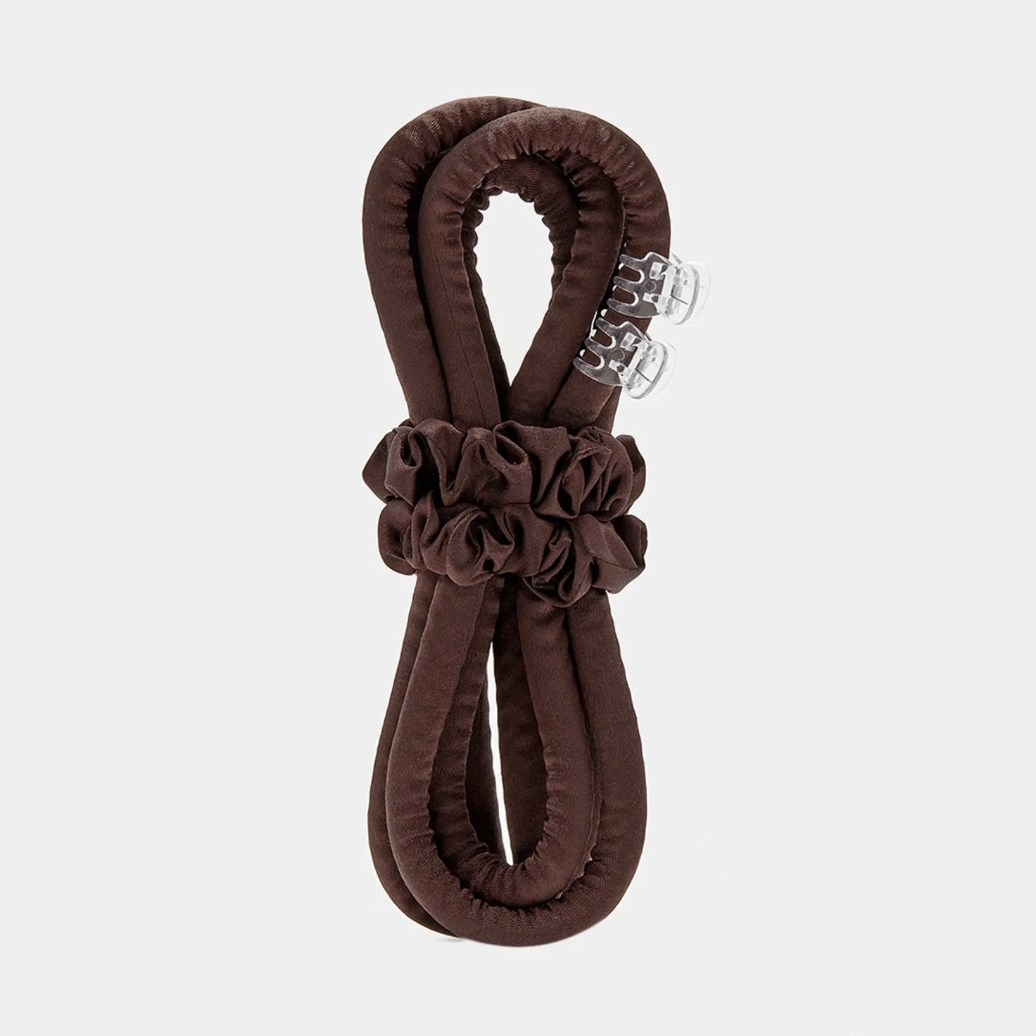Secure the curler on one side with a claw clip and begin twisting the curls around it, starting from the top and going downwards in horizontal sections. Once you get to the bottom, tie the hair around the curler using a hairband, and use a claw clip to hold the curler in place
