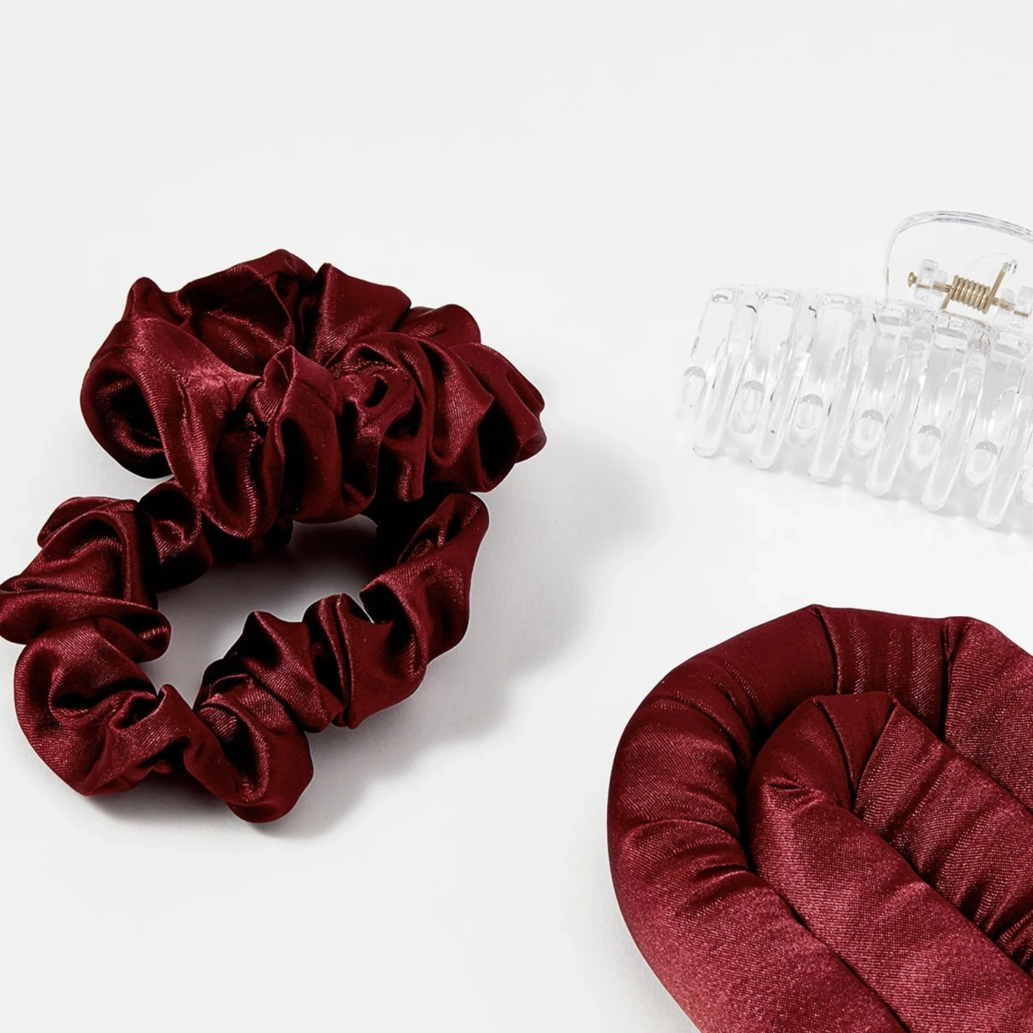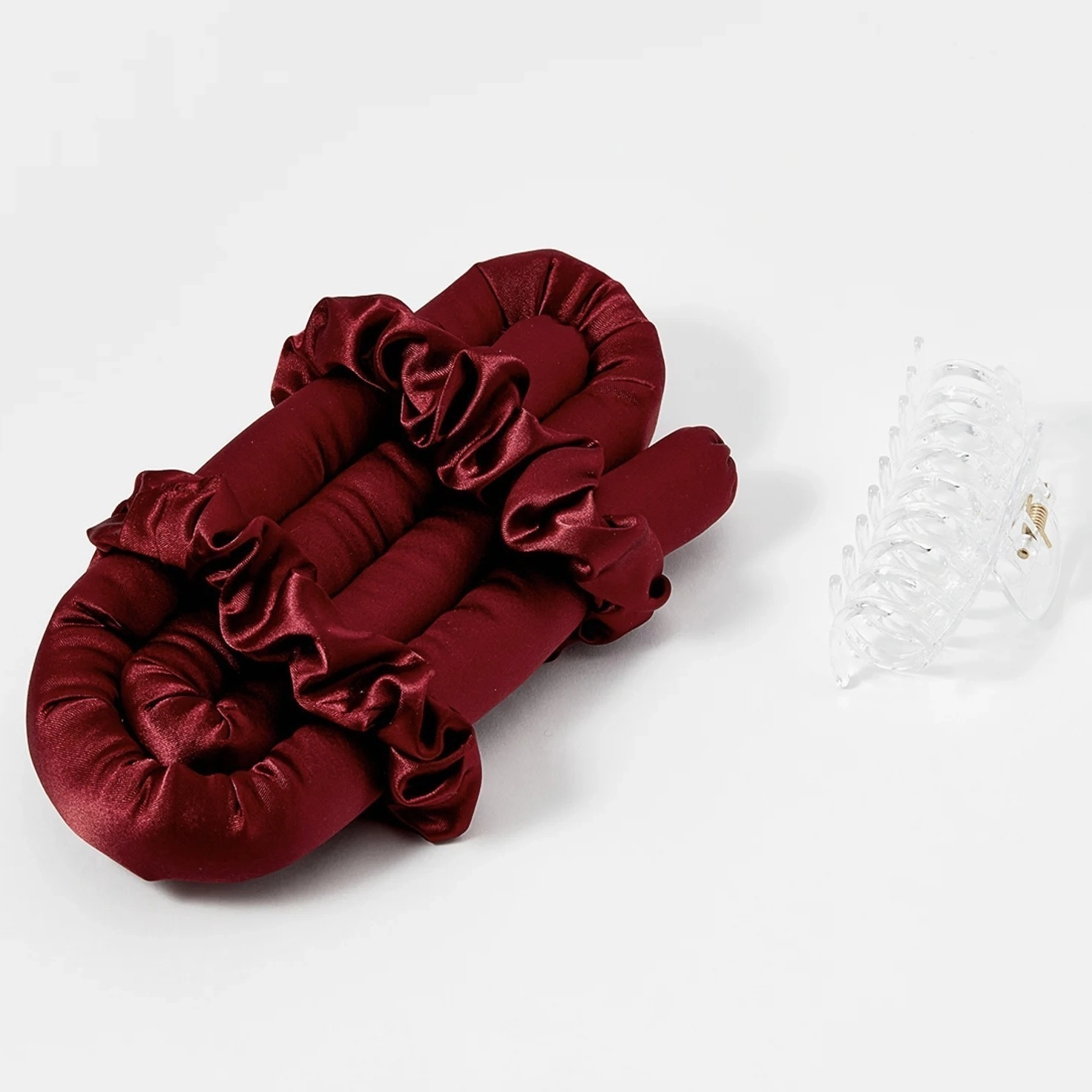Secure the curler on one side with a claw clip and begin twisting the curls around it, starting from the top and going downwards in horizontal sections. Once you get to the bottom, tie the hair around the curler using a hairband, and use a claw clip to hold the curler in place