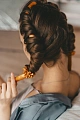 Secure the curler on one side with a claw clip and begin twisting the curls around it, starting from the top and going downwards in horizontal sections. Once you get to the bottom, tie the hair around the curler using a hairband, and use a claw clip to hold the curler in place
