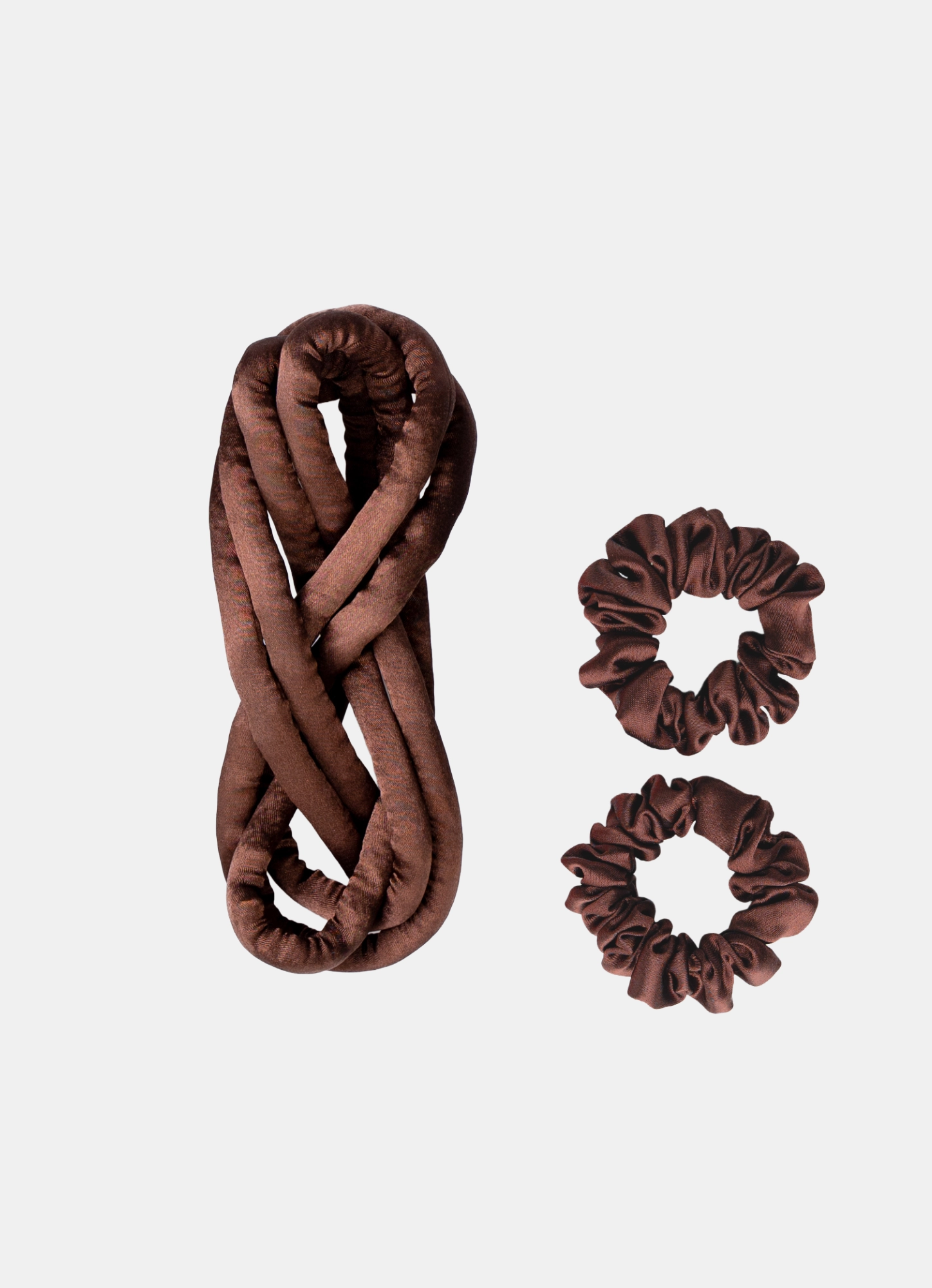 Secure the curler on one side with a claw clip and begin twisting the curls around it, starting from the top and going downwards in horizontal sections. Once you get to the bottom, tie the hair around the curler using a hairband, and use a claw clip to hold the curler in place