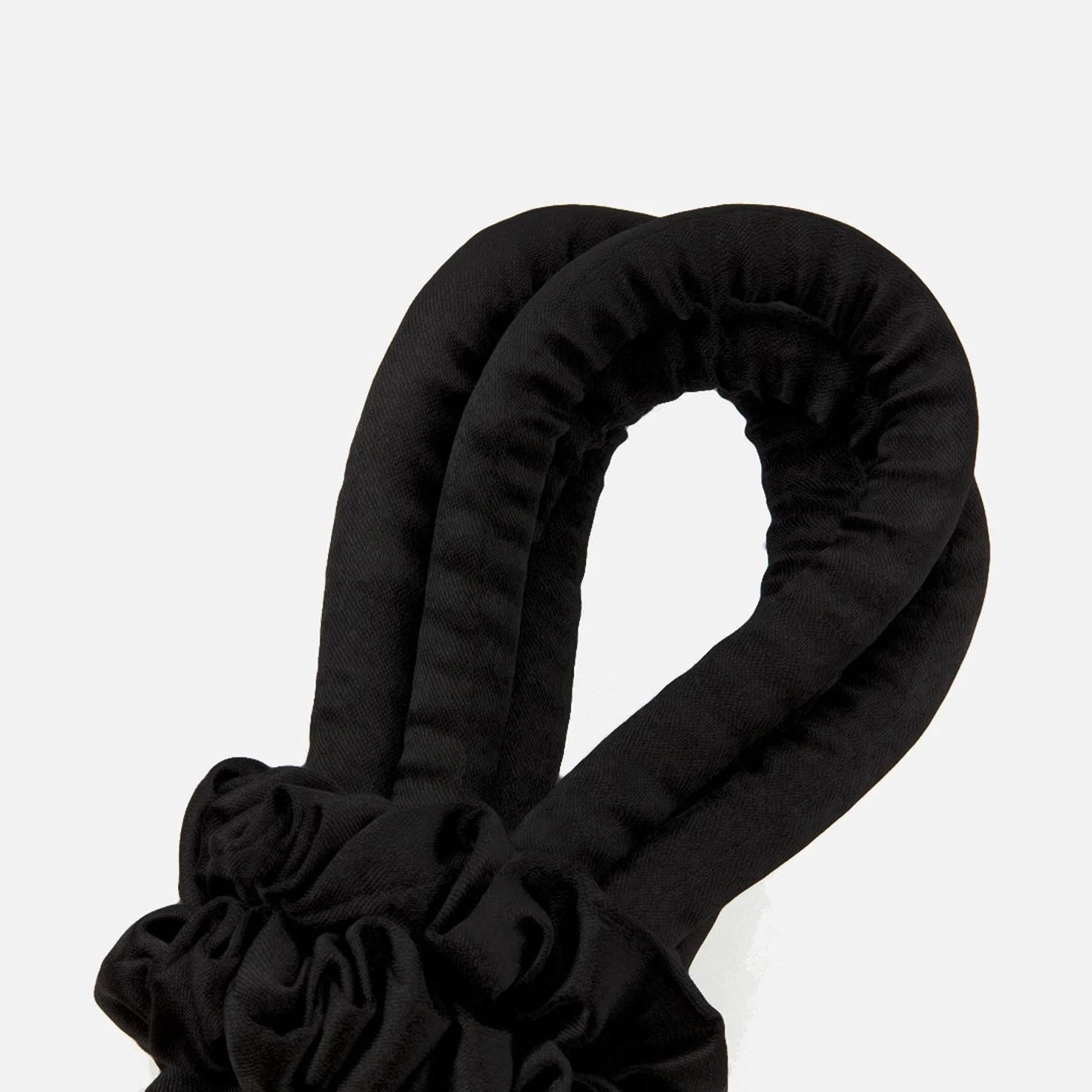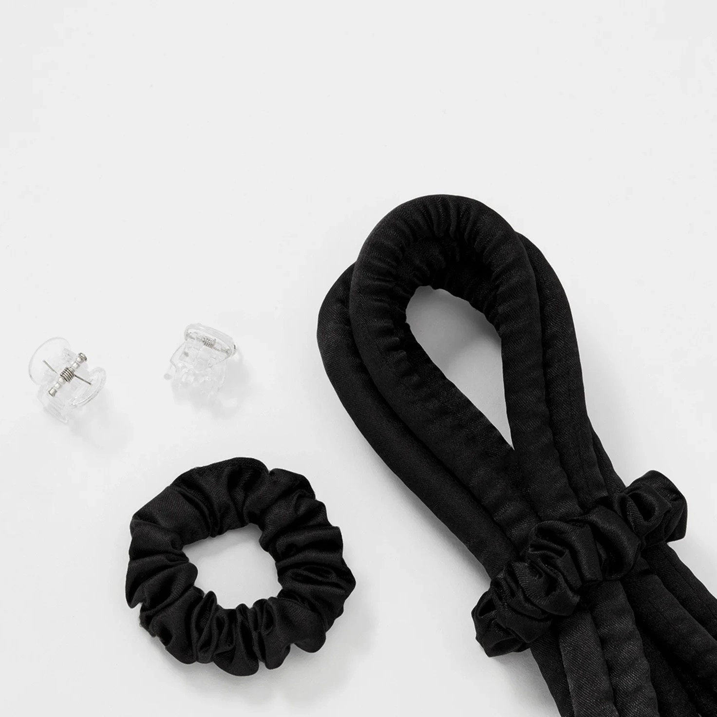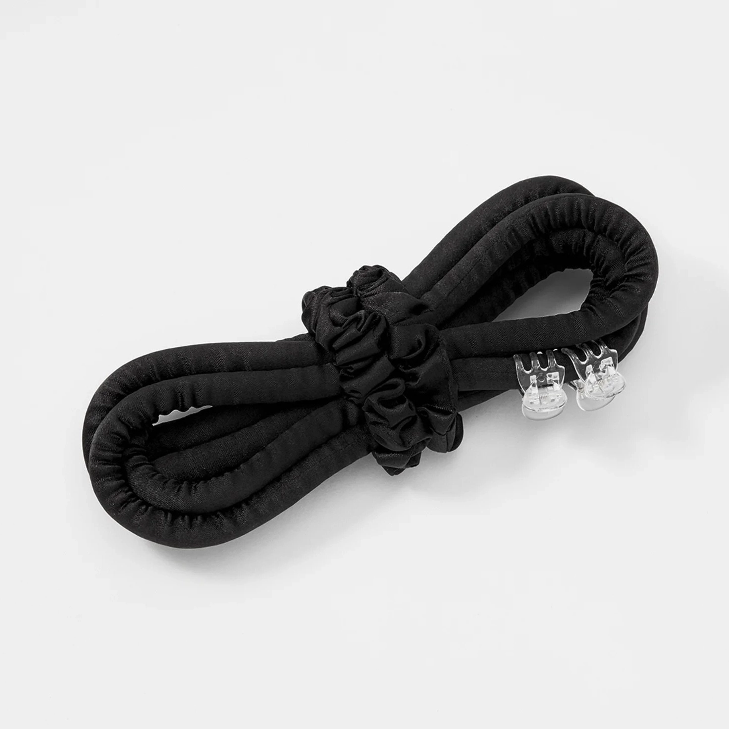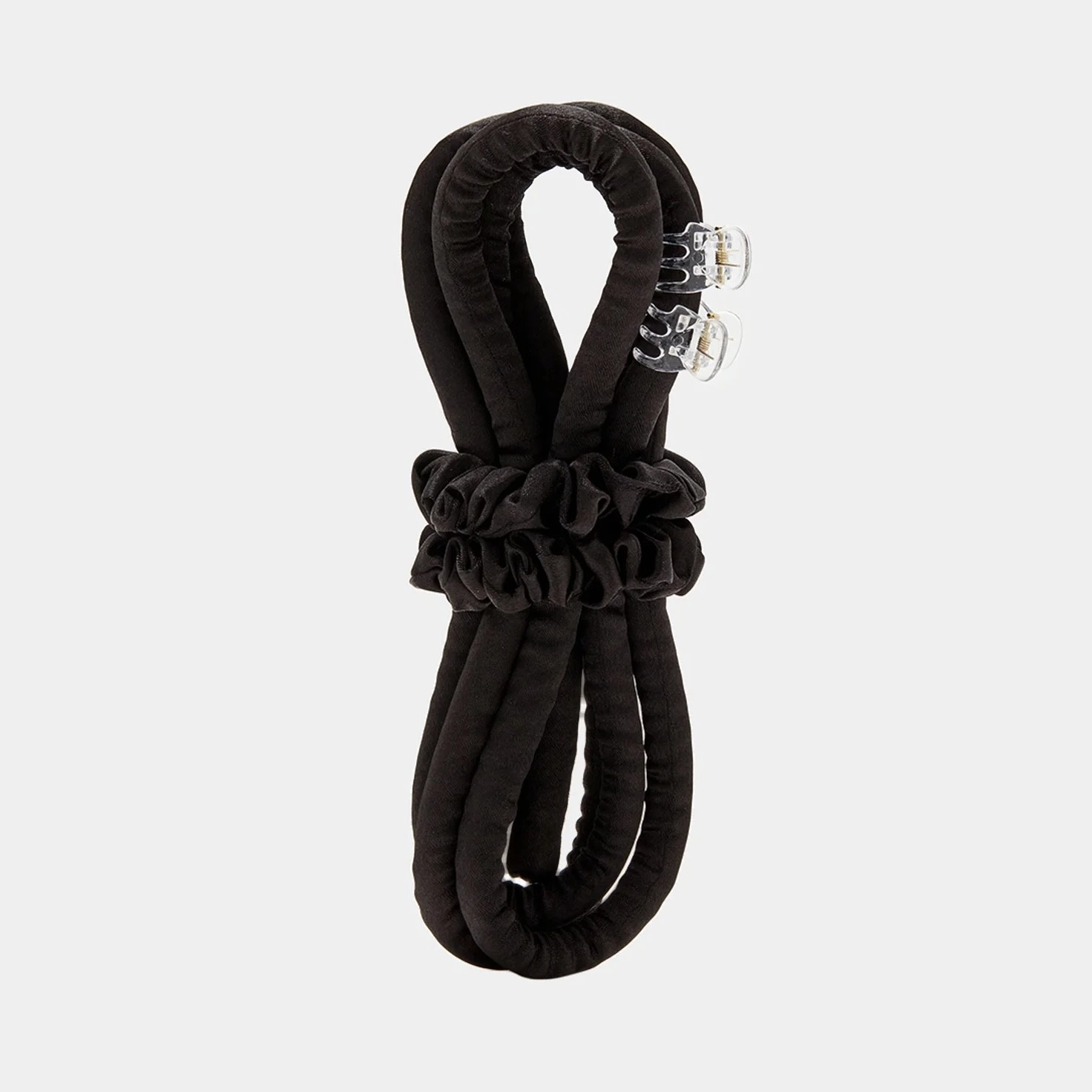 Secure the curler on one side with a claw clip and begin twisting the curls around it, starting from the top and going downwards in horizontal sections. Once you get to the bottom, tie the hair around the curler using a hairband, and use a claw clip to hold the curler in place