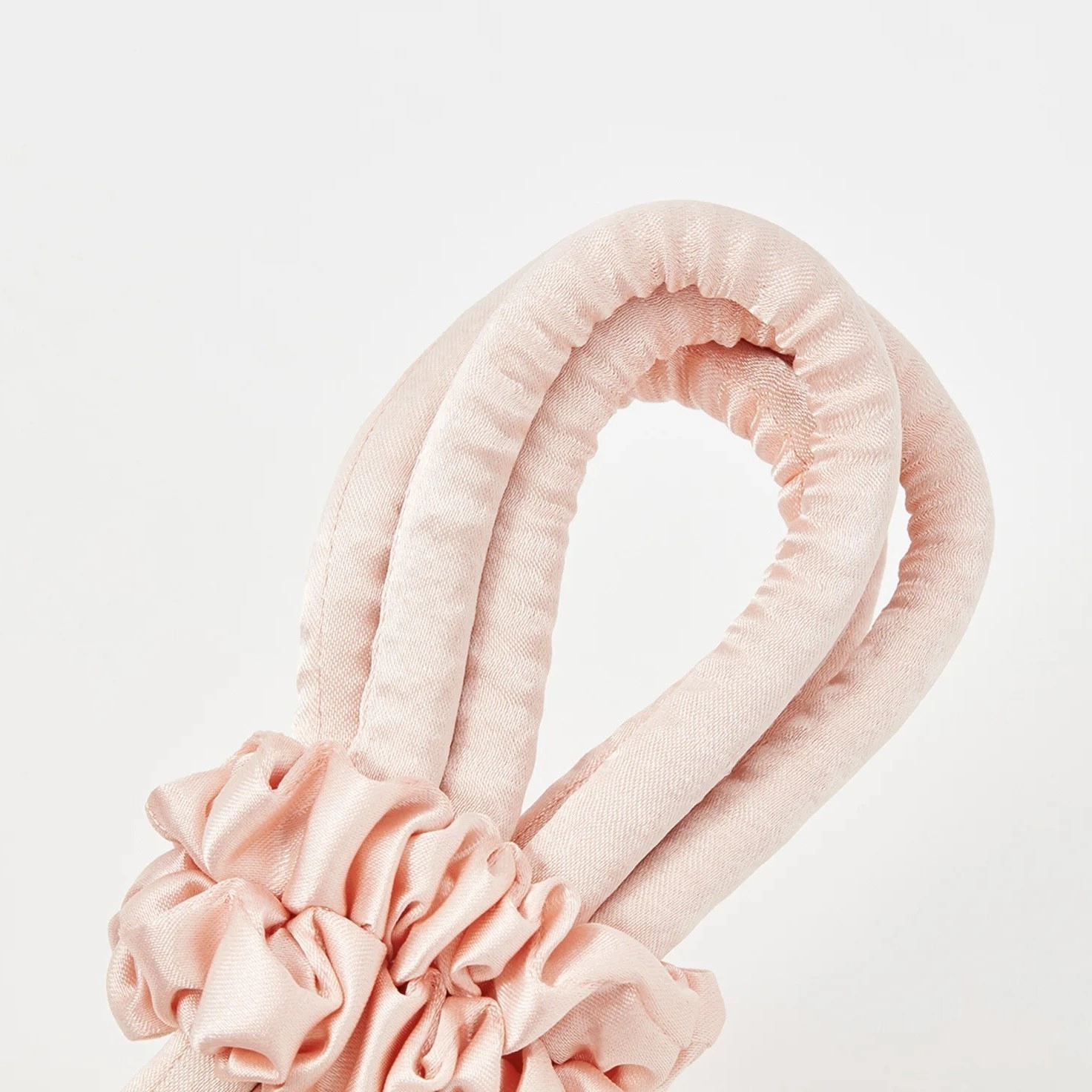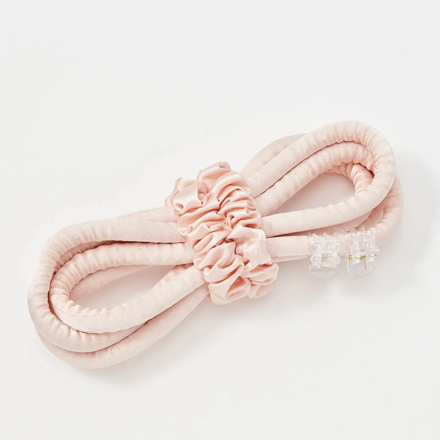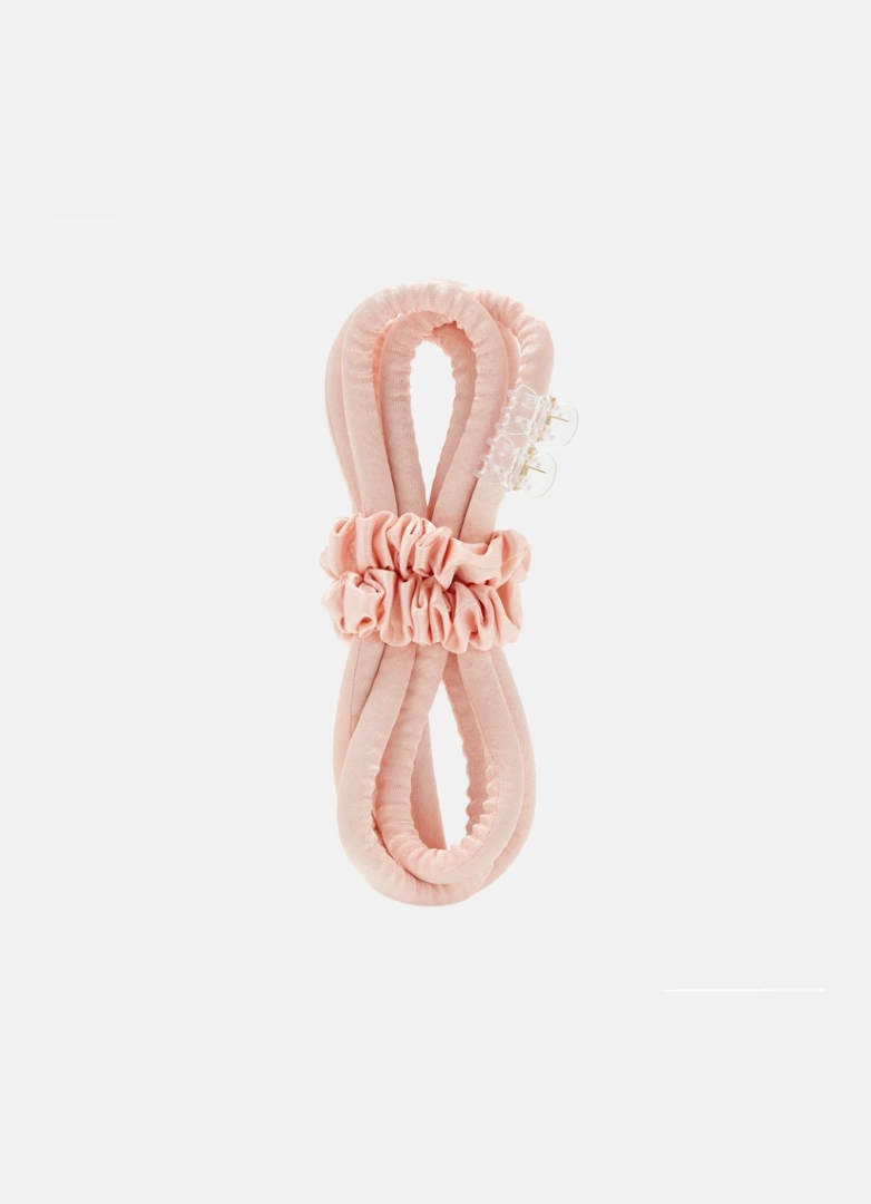 Secure the curler on one side with a claw clip and begin twisting the curls around it, starting from the top and going downwards in horizontal sections. Once you get to the bottom, tie the hair around the curler using a hairband, and use a claw clip to hold the curler in place