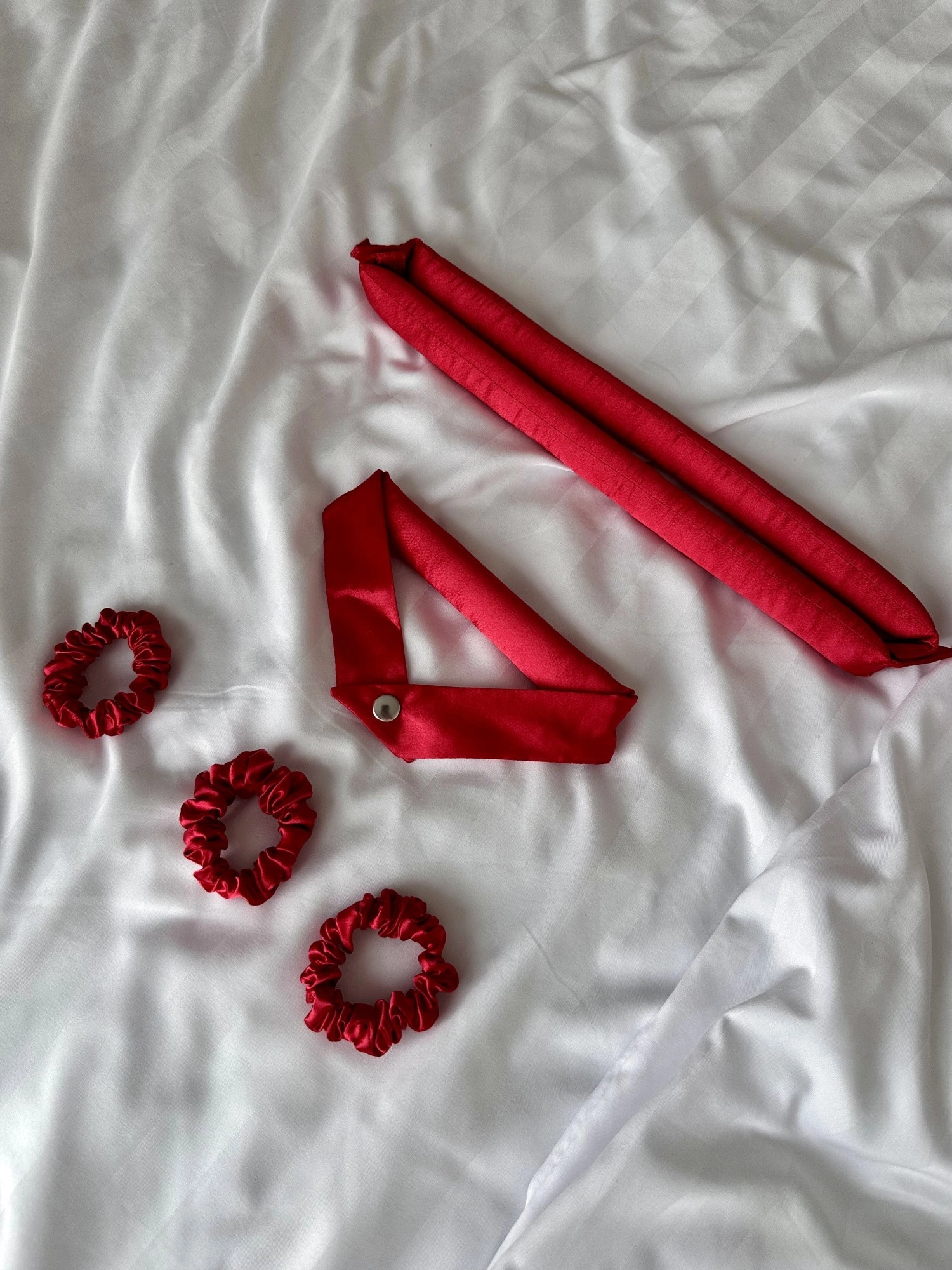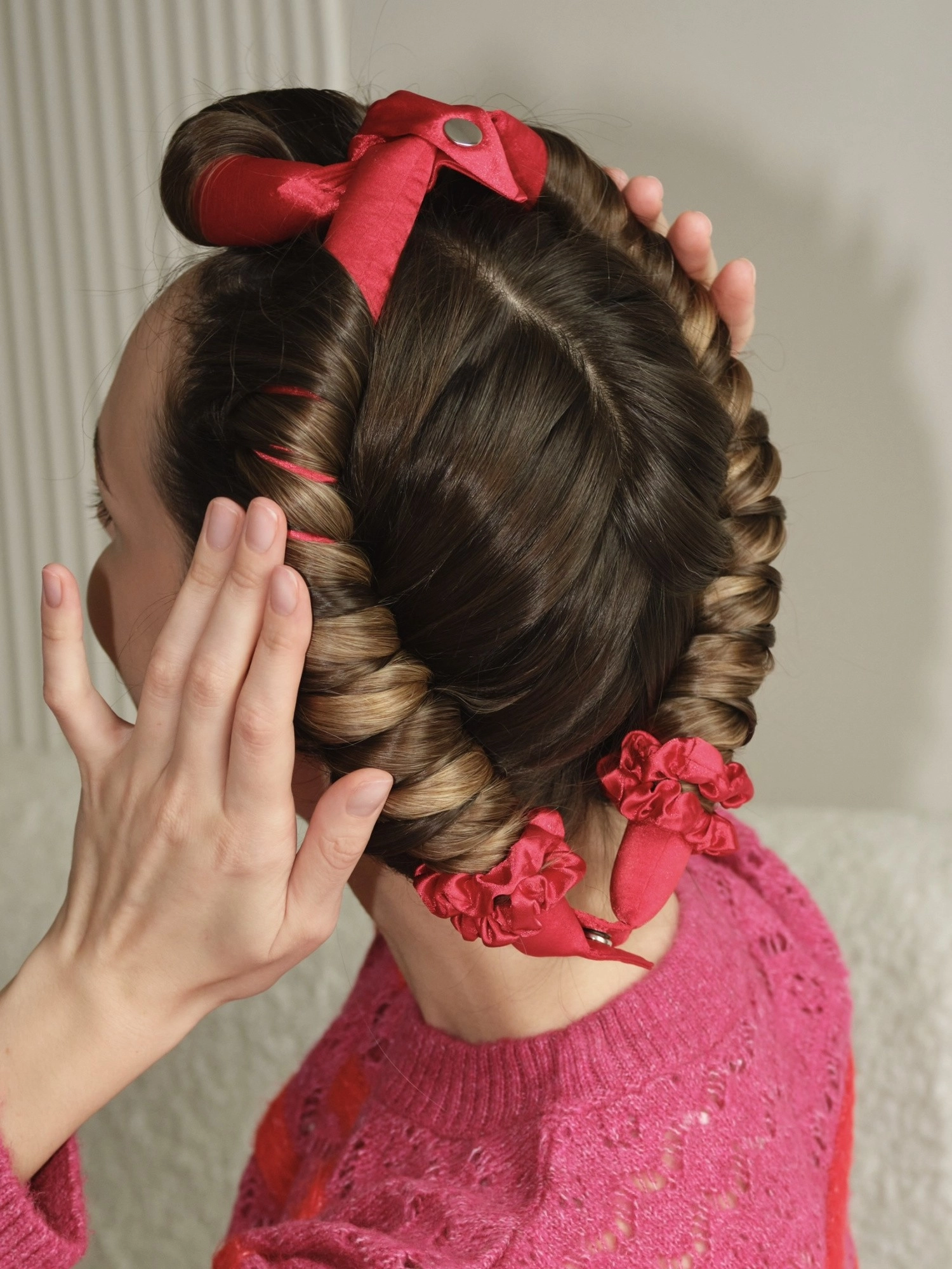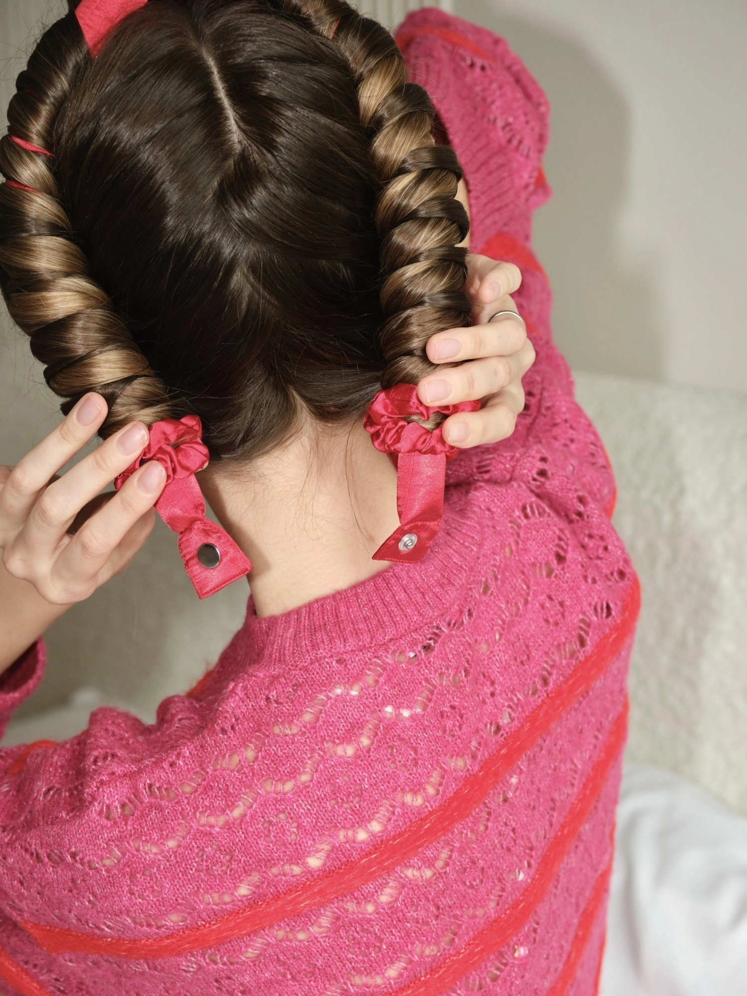 Secure the curler on one side with a claw clip and begin twisting the curls around it, starting from the top and going downwards in horizontal sections. Once you get to the bottom, tie the hair around the curler using a hairband, and use a claw clip to hold the curler in place