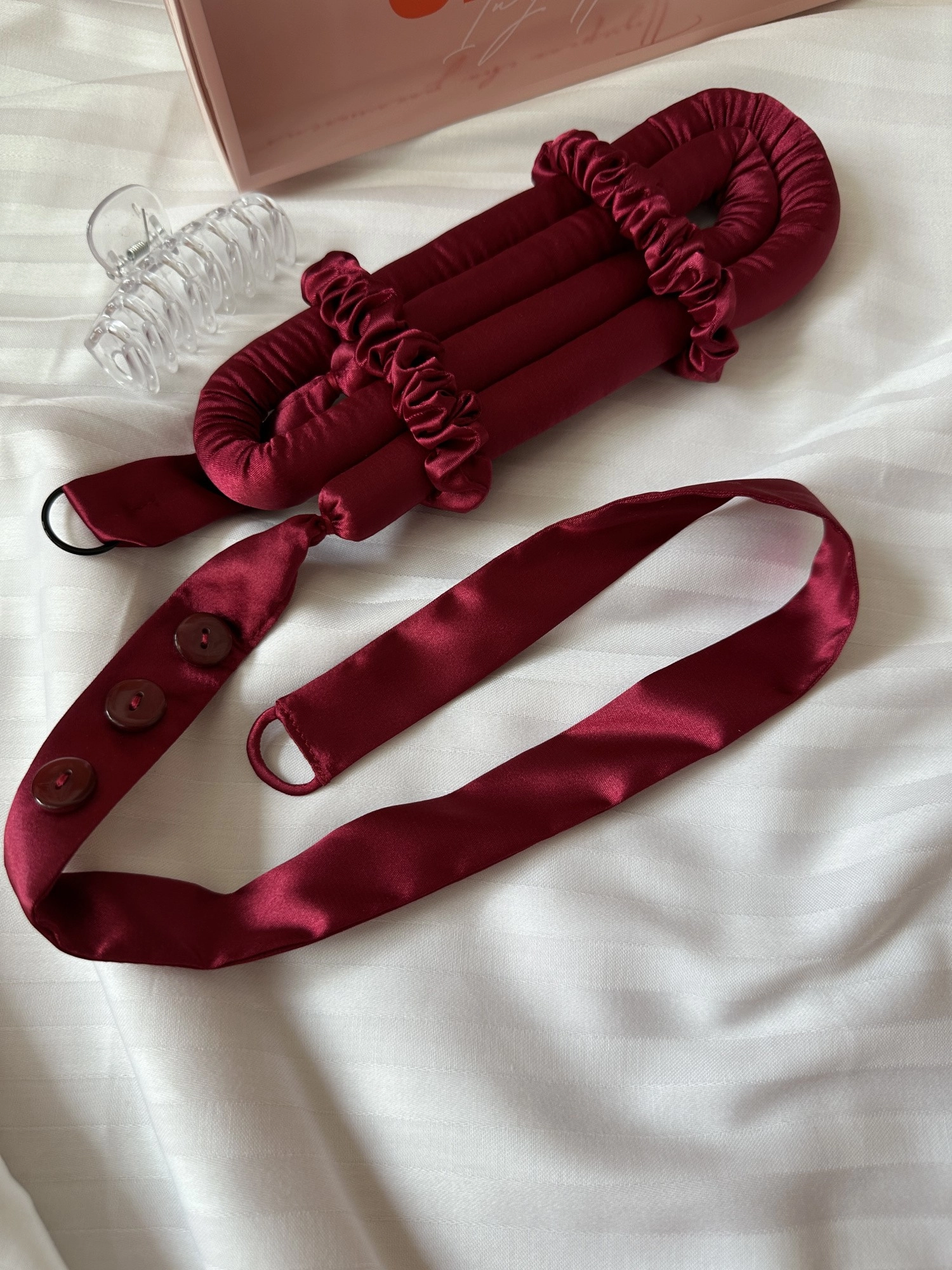 Secure the curler on one side with a claw clip and begin twisting the curls around it, starting from the top and going downwards in horizontal sections. Once you get to the bottom, tie the hair around the curler using a hairband, and use a claw clip to hold the curler in place
