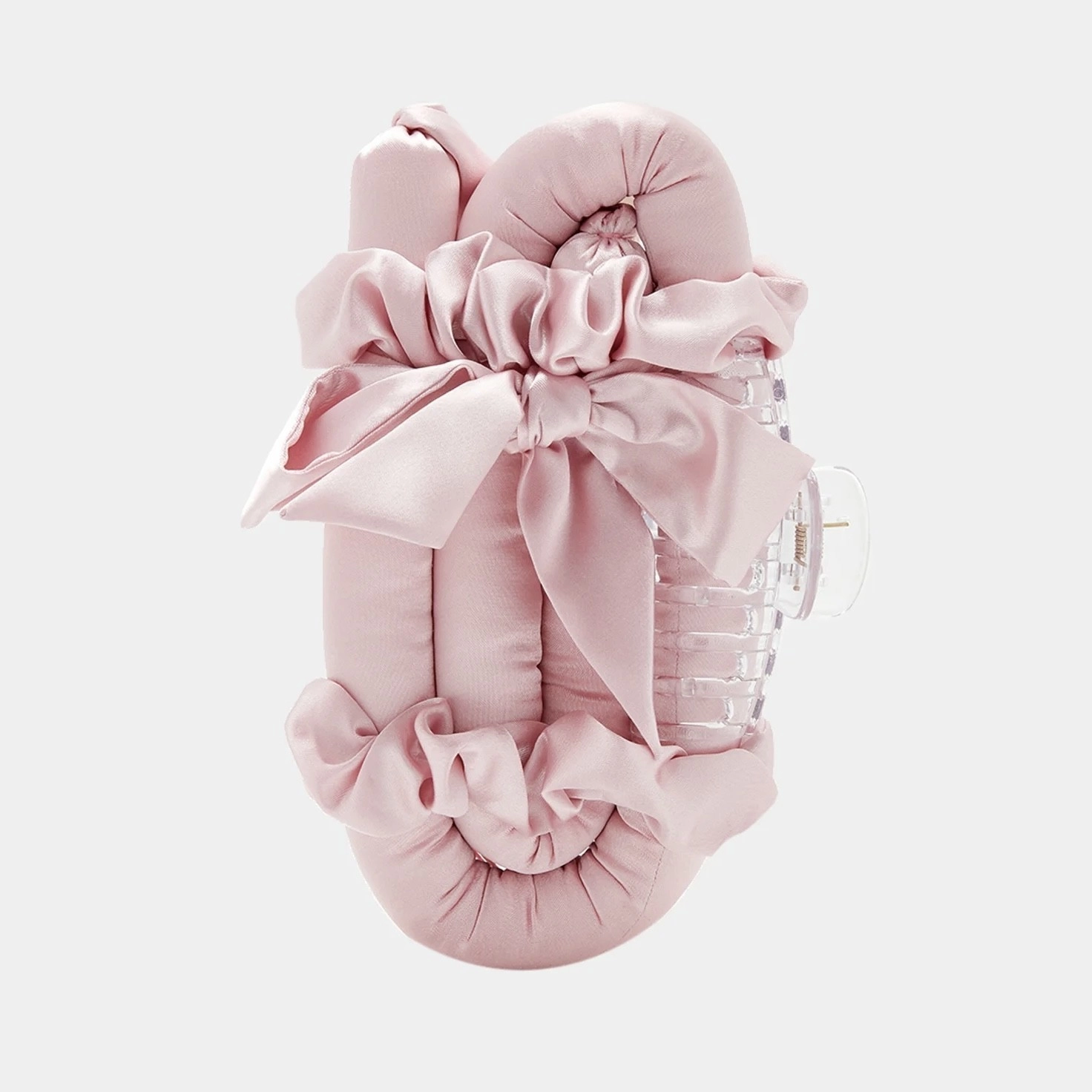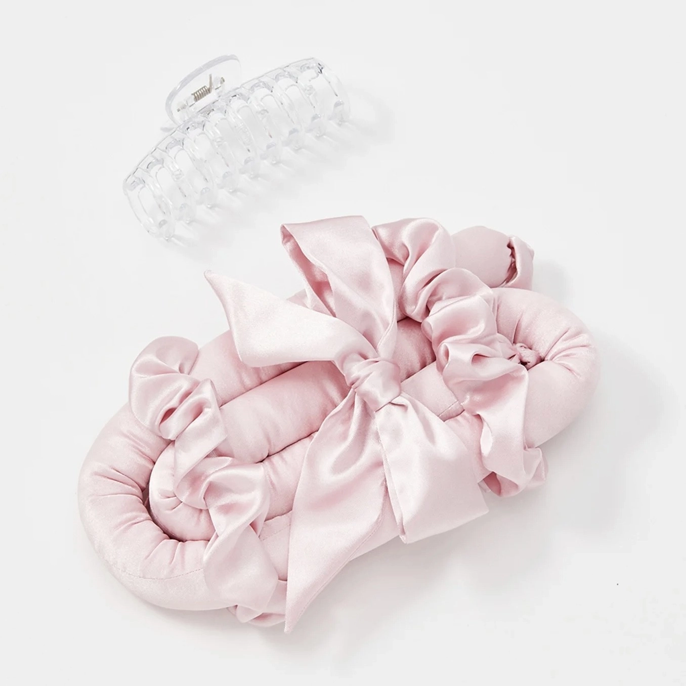 Secure the curler on one side with a claw clip and begin twisting the curls around it, starting from the top and going downwards in horizontal sections. Once you get to the bottom, tie the hair around the curler using a hairband, and use a claw clip to hold the curler in place