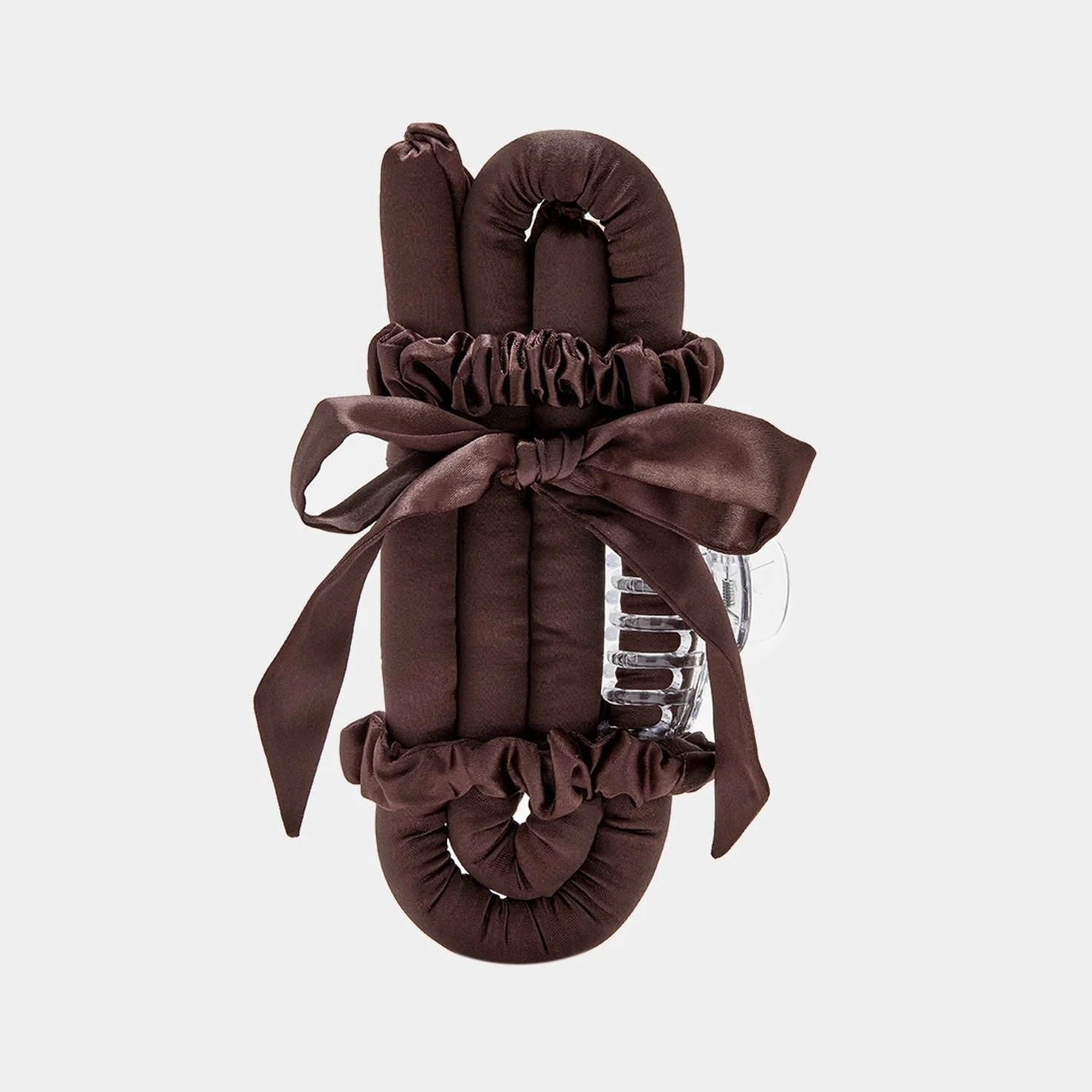 Secure the curler on one side with a claw clip and begin twisting the curls around it, starting from the top and going downwards in horizontal sections. Once you get to the bottom, tie the hair around the curler using a hairband, and use a claw clip to hold the curler in place