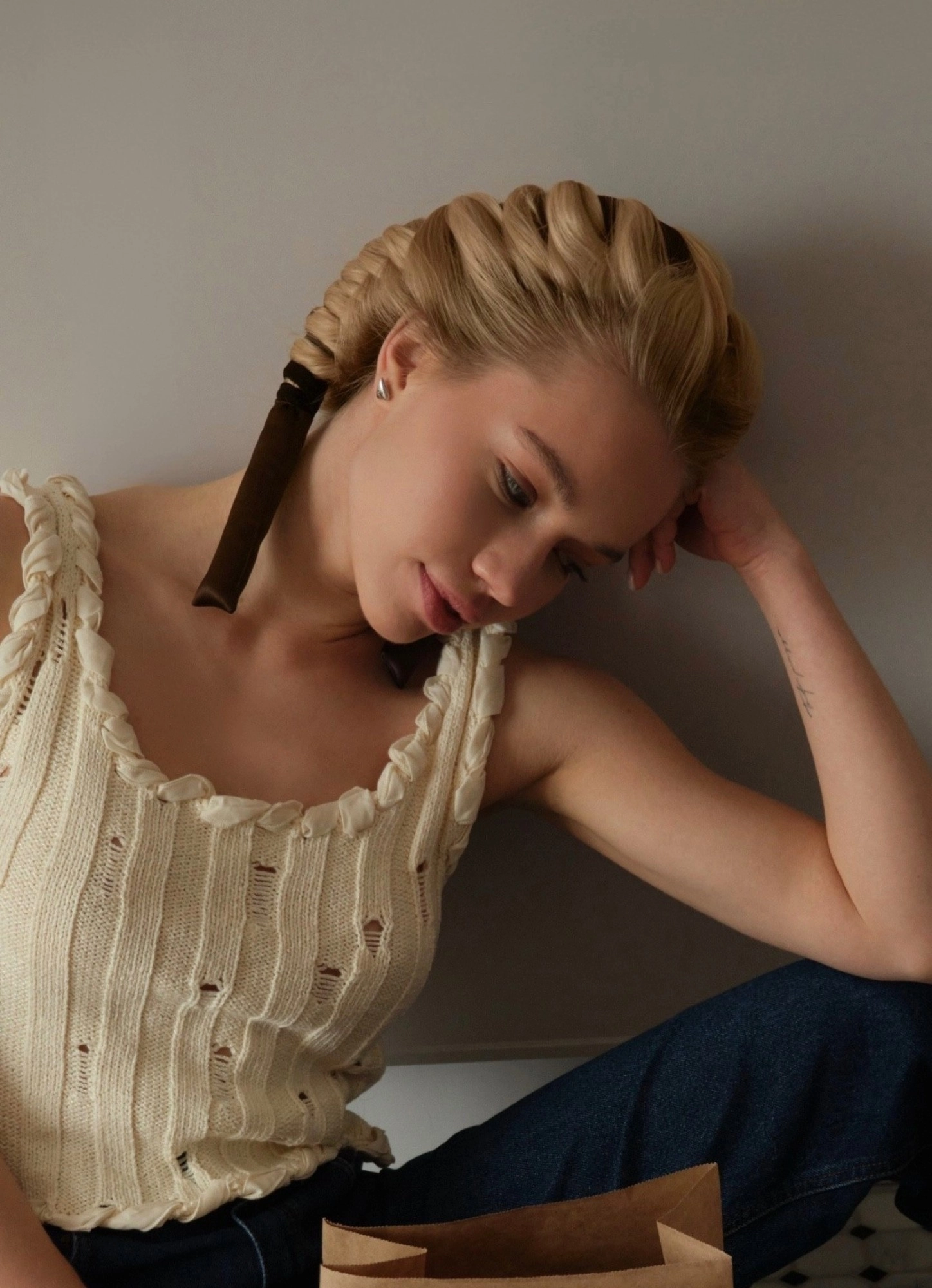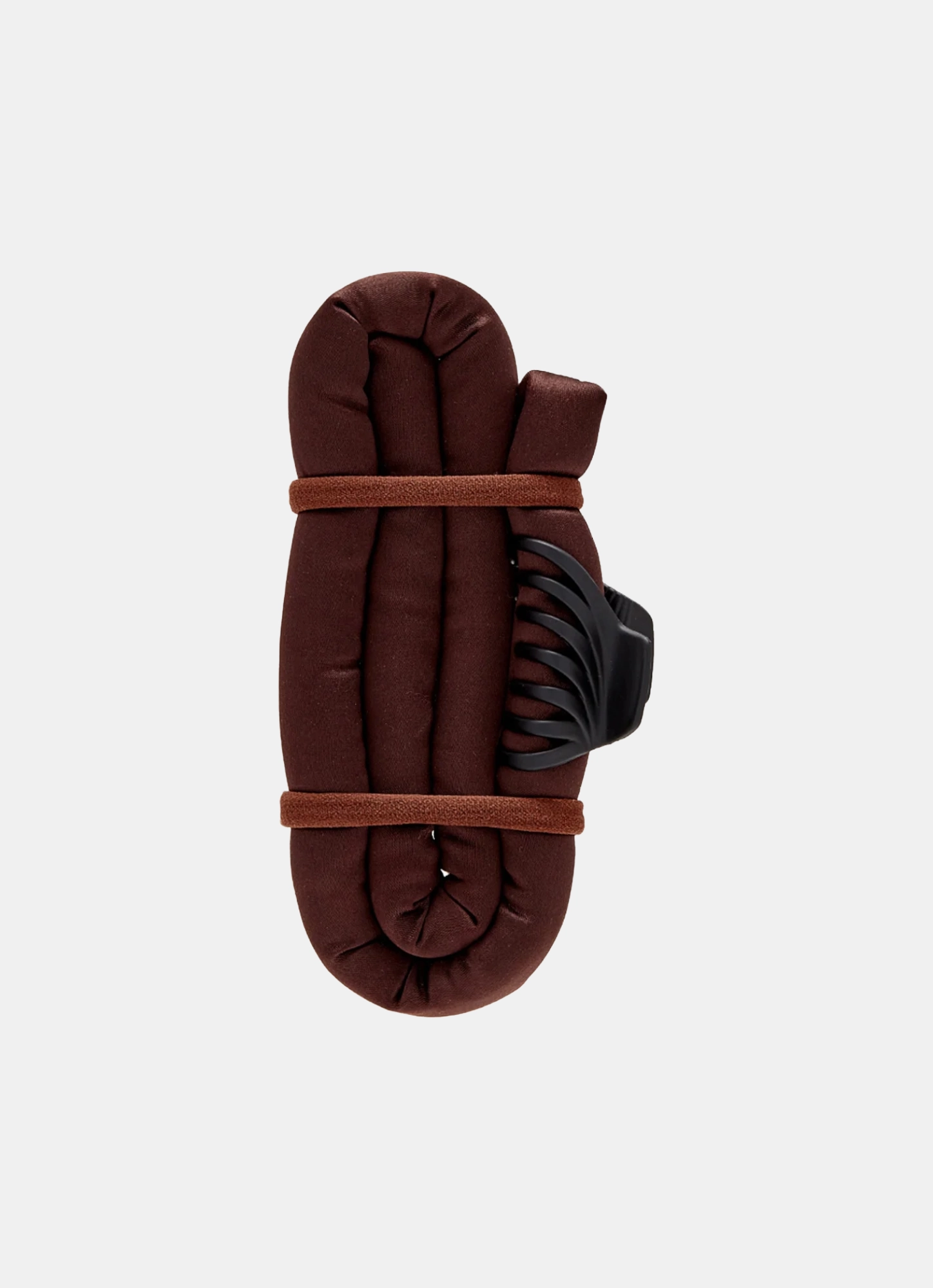 Secure the curler on one side with a claw clip and begin twisting the curls around it, starting from the top and going downwards in horizontal sections. Once you get to the bottom, tie the hair around the curler using a hairband, and use a claw clip to hold the curler in place