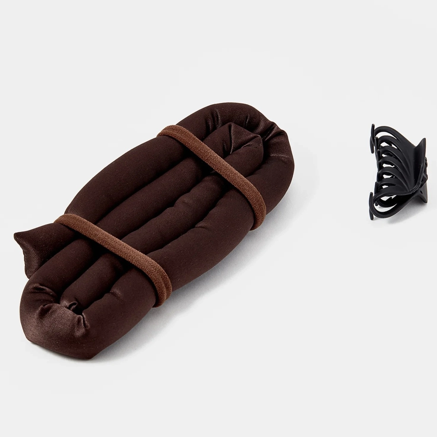 Secure the curler on one side with a claw clip and begin twisting the curls around it, starting from the top and going downwards in horizontal sections. Once you get to the bottom, tie the hair around the curler using a hairband, and use a claw clip to hold the curler in place
