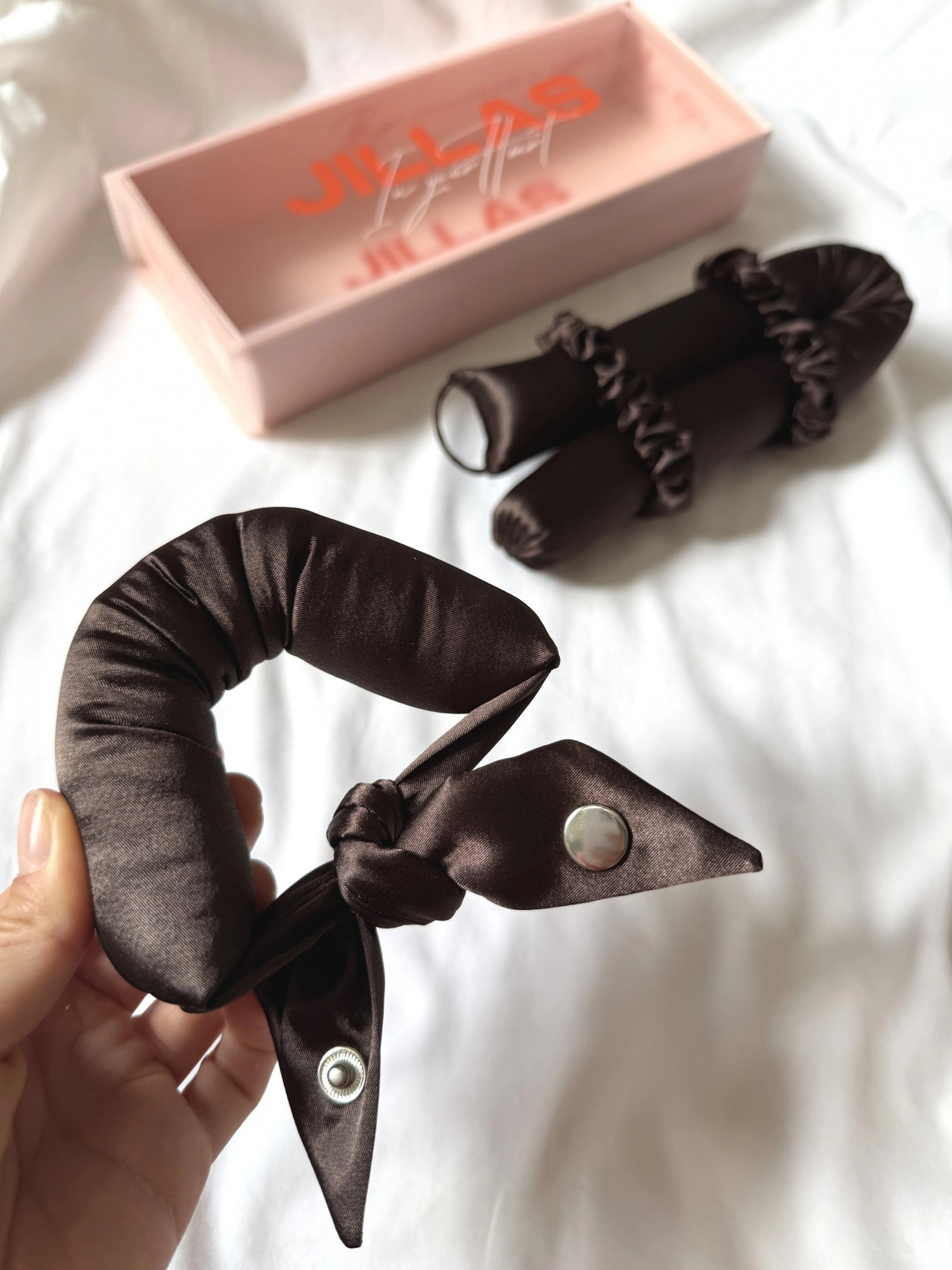 Secure the curler on one side with a claw clip and begin twisting the curls around it, starting from the top and going downwards in horizontal sections. Once you get to the bottom, tie the hair around the curler using a hairband, and use a claw clip to hold the curler in place